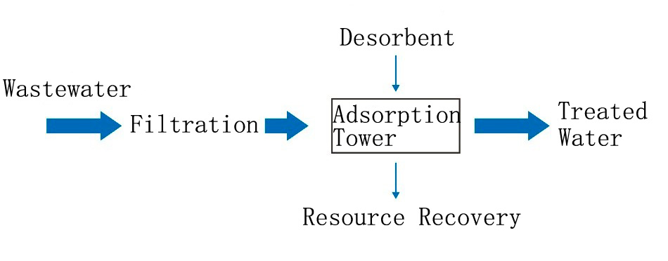 The principle of the Haipu adsorption process is to use the special adsorption materials developed by our company to selectively adsorb the components or substances to be removed. When the adsorption is saturated, a specific desorption agent is used to desorb the adsorption material, allowing it to be regenerated. This process is continuously repeated. The conventional process of treating wastewater by adsorption method is shown in the following figure.