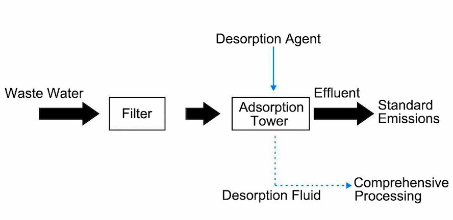 When the adsorption is nearly saturated and the effluent is about to exceed the standard, a specific desorbent is used to desorb the adsorbent material, regenerating it for continued adsorption, thus continuously cycling.