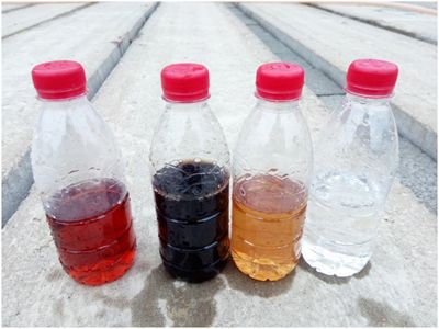 From left to right: desorption liquid (recovered organic matter), raw water, pre-treatment, adsorption effluent.