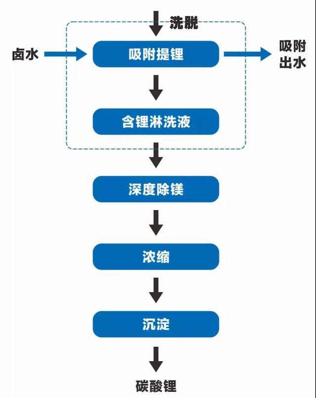 The production process of lithium carbonate with special lithium adsorbent DL760 adsorption as the core includes four steps: lithium extraction, deep magnesium removal, concentration, and precipitation.